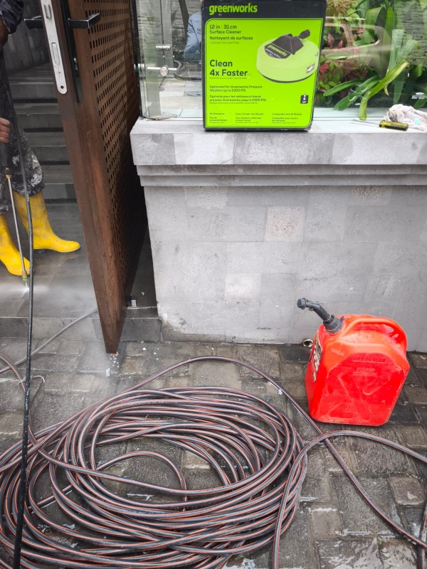 Finalmente, se realizó un enjuague profundo con hidrolavadora, asegurando la eliminación completa de residuos, suciedad desprendida y remanentes del proceso de limpieza. El control de la presión y la distancia de aplicación fue determinante para limpiar a profundidad sin erosionar el sustrato.